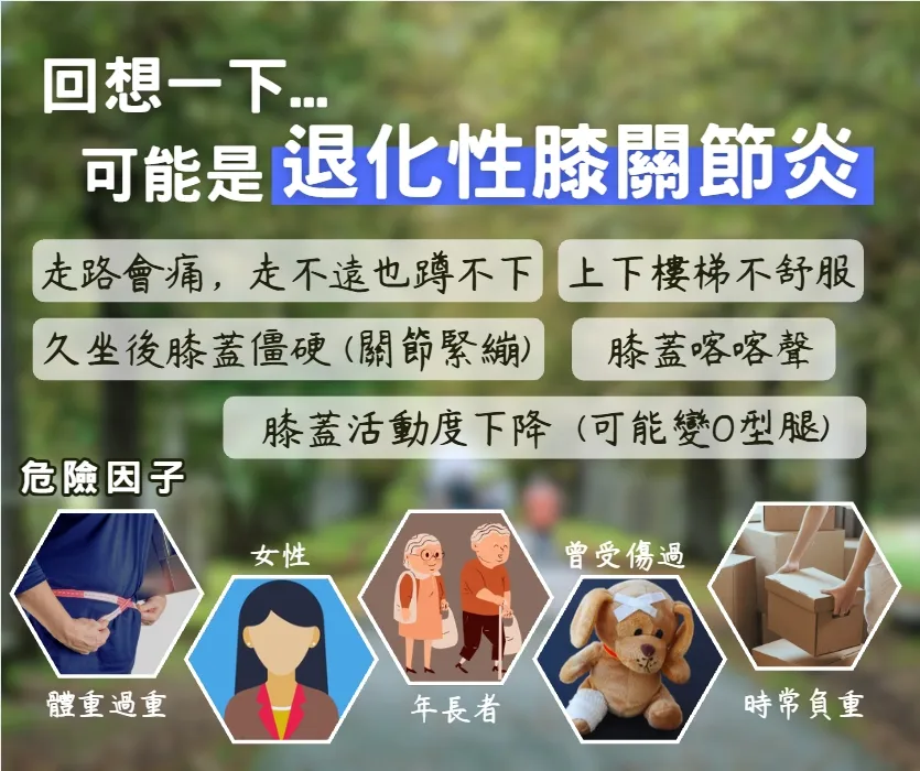 【誰是高風險族群?】 如果您符合以下條件,更需要特別留意膝蓋保養:體重過重者、女性、年長者、膝蓋曾受傷過,或是時常負重搬運的工作者。