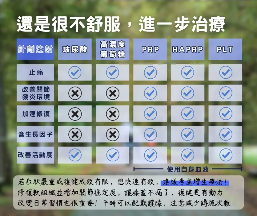 若您希望修復軟組織並增加關節穩定度,讓膝蓋不痛了、復健更有動力,建議優先考慮增生療法!