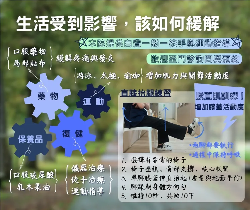 當膝蓋問題影響生活品質時,我們採用多管齊下的治療策略: